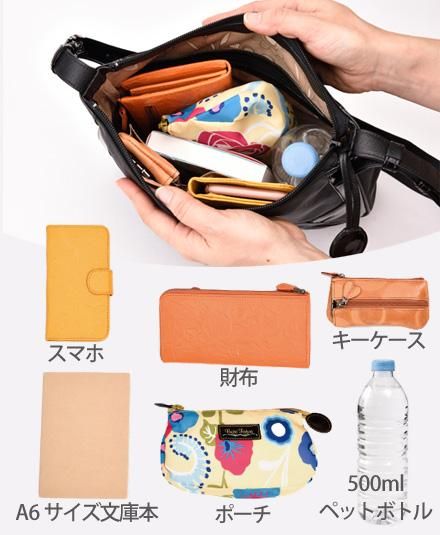 500mlのペットボトル、長財布、スマホ、パスケース、カギや手帳、ポーチといったアイテムが入ります。