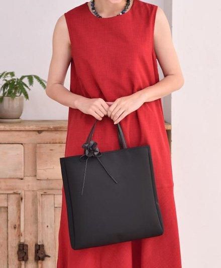 肉厚で上質なナイロンに本革を組み合わせた、高級感のある大人のための手提げバッグです。取り外しできるお花のコサージュ(牛革)が華やかをアップ!