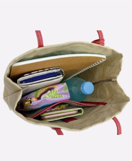 ハンド 小 縦長はマチを開いて整えると、500mlのペットボトル、A5サイズのノート、長財布、ポーチ、スマホ、パスケース、カギといったアイテムが入ります。