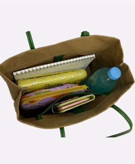 ちょっとそこまでのお出かけにちょうどいいサイズ感です。マチを開く前は2cmの薄さなので、サブバッグやエコバッグとしても携帯しやすくなっています。