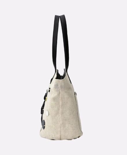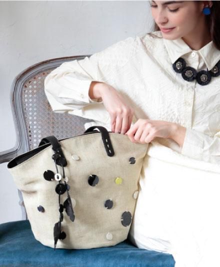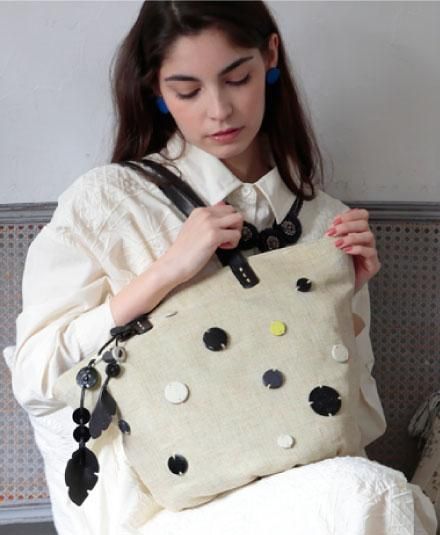 軽やかな風合いの麻にほっこりボタン(牛革)が楽しいラゲット。ボタニカルな雰囲気のおしゃれなバッグチャームがアクセントです。