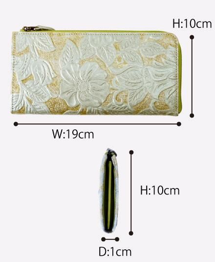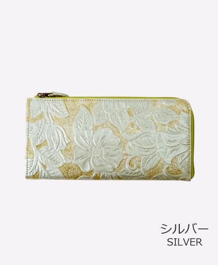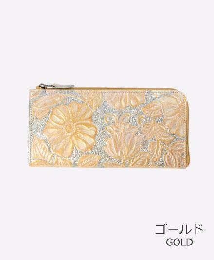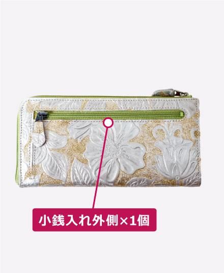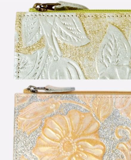 クラシカルな花模様の型押しとゴールドとシルバーの組み合わせが洋装でも和装でも合わせて頂けます。ゴージャスな印象ながら奥ゆかしい上品なデザイン。