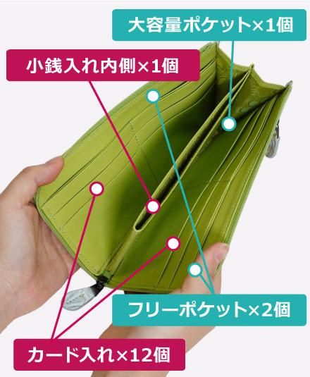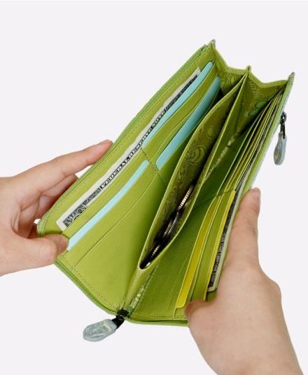 L字ファスナーで大きく開き、整理しやすく、使いやすいお財布です。