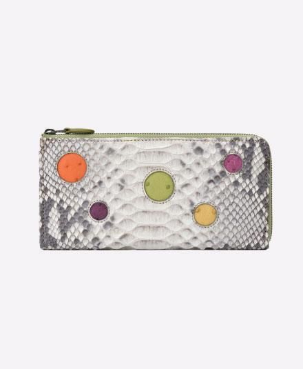 金運が強いと言われているパイソンを使用。オーストリッチのカラフルなドットが女性らしく、他にないデザインとなっています。