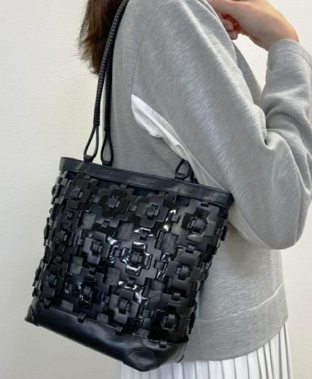 かごバッグのように軽やかな雰囲気でありながら、上質な革の質感で確かな存在感を演出。丁寧に巻きが施されたショルダー部分がしっくりと手に馴染みます。