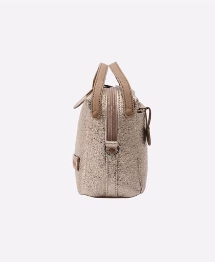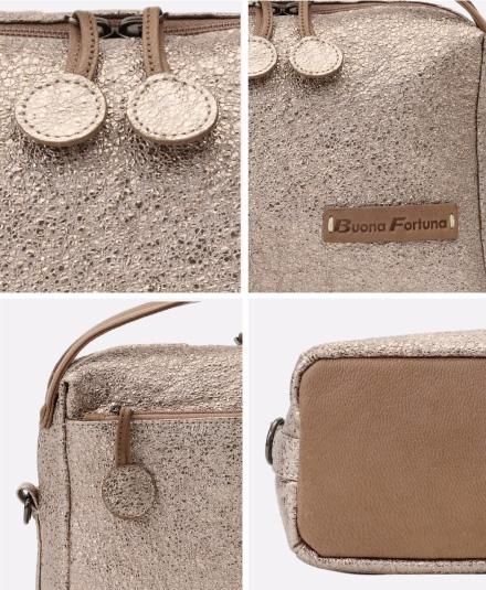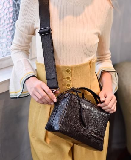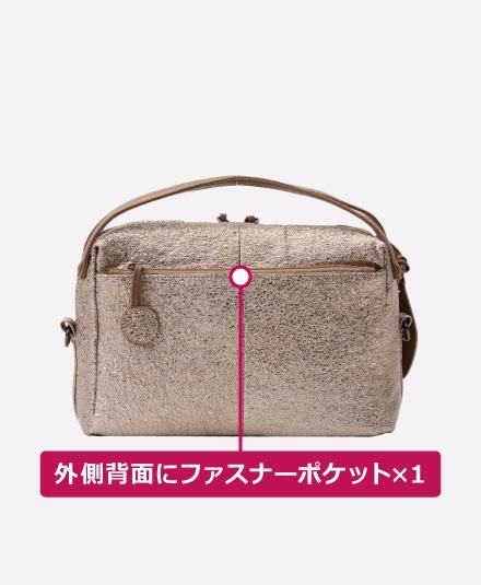 トレンド感のあるスクエアフォルムのショルダーバッグ。ゴート箔の牛革が高級感と華やかさを感じさせます。取り外し可能な葉のチャームがワンポイント。