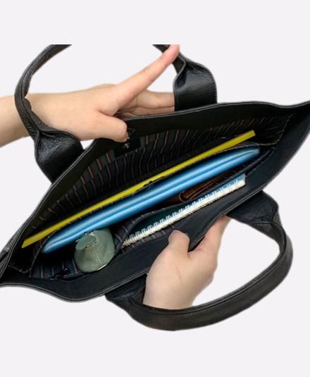 スリムな見た目ですが、底マチがあり荷物によって対応します。A4サイズのファイル、タブレットやPC、B5サイズのノート、長財布、スマホ、パスケース、ペンケース、といったアイテムが入ります。(500mlのペットボトルを入れることもできます)