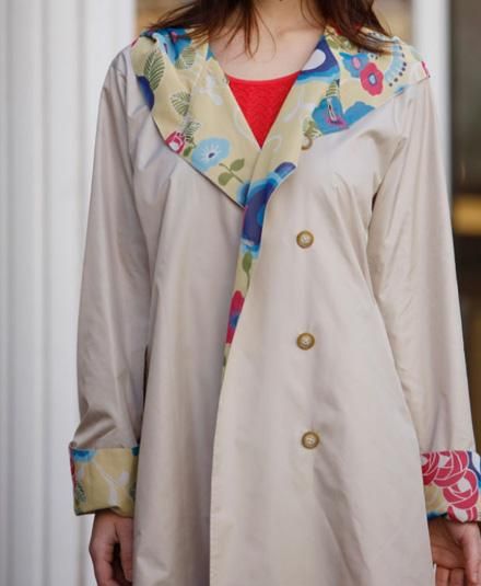さっと気軽に羽織れて、スッキリと見えるショート丈のコートです。袖口やフードから見えるフラワープリント(ファンタジア柄)が華やかでお洒落。