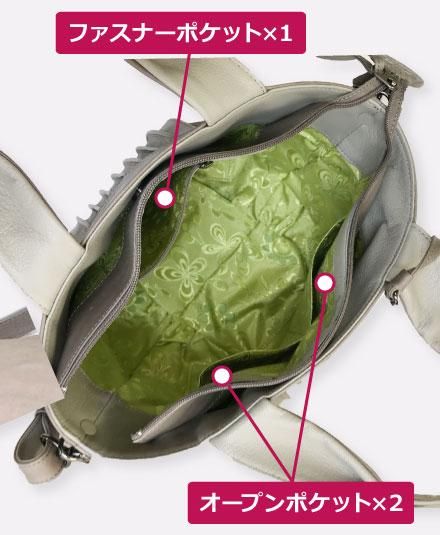内側:片マチ付きオープンポケット×2、ファスナーポケット×1