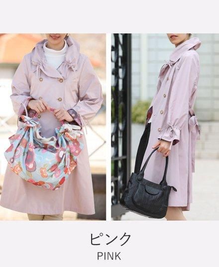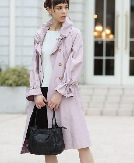 リボンの付いたショールカラーが優しい雰囲気のコートです。パンツにもスカートにも似合う丈感。袖口を折ると顔を出すフラワープリント(ファンタジア柄)。ウエストマークのできるベルト。こだわりのディーテールが光る、エレガントにもカジュアルにも着こなせます。