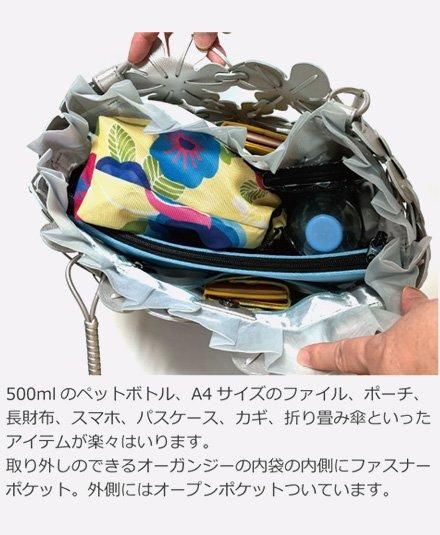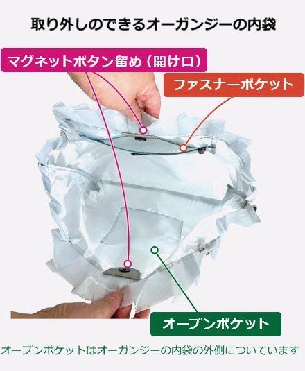 内袋(インナー)のオーガンジーには、内側にファスナーポケット、外側にはスマートフォンが差しこめるオープンポケットが付いています。開け口にはマグネットボタンが付いているので中身の丸見えを防げます。バッグにはスナップボタンで固定されていますが、取り外してお手持ちの内袋を使うこともできます。