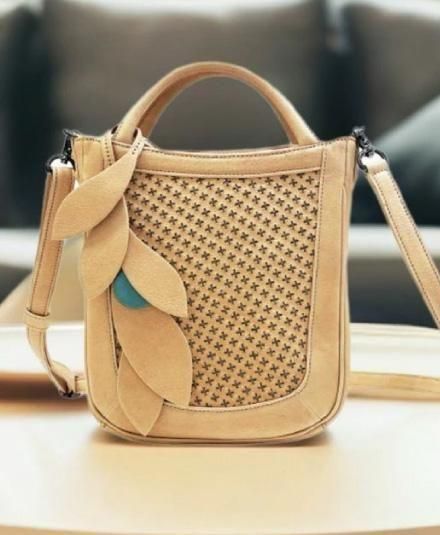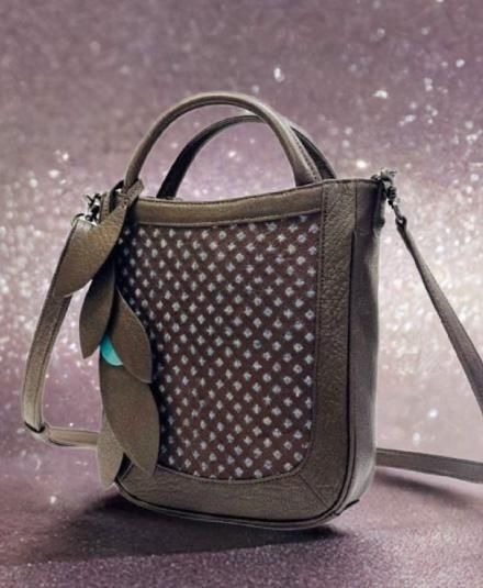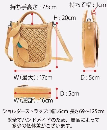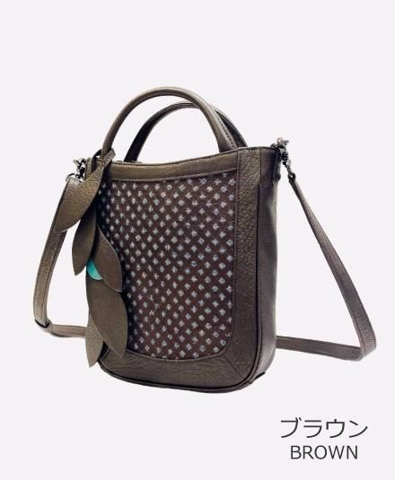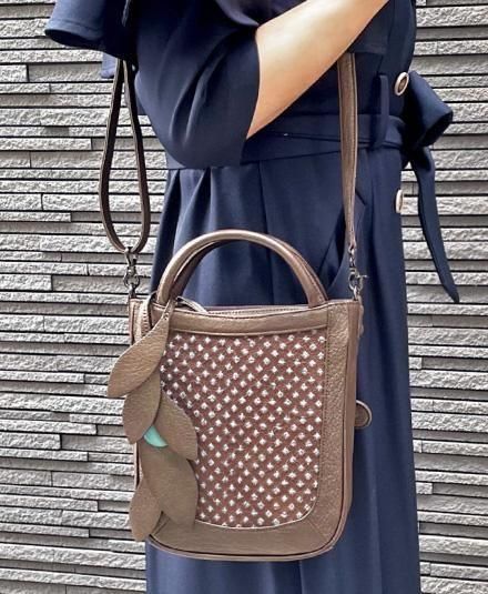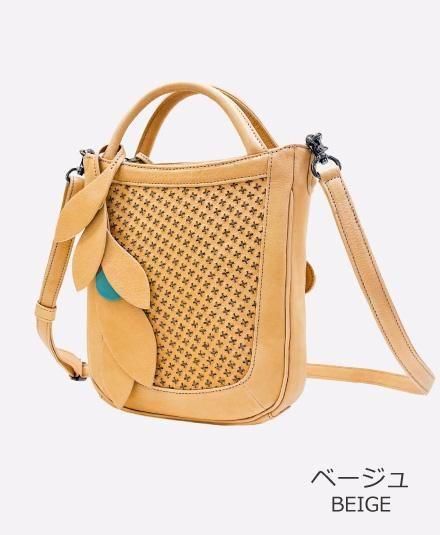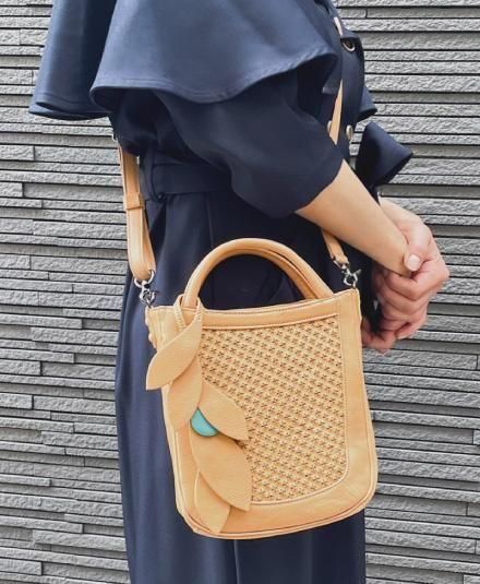 葉のモチーフのバッグチャーム(取り外し可能)が、ほどよいアクセントになっています。