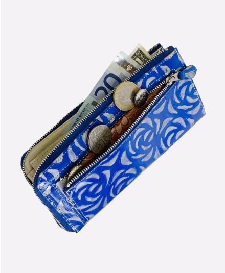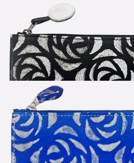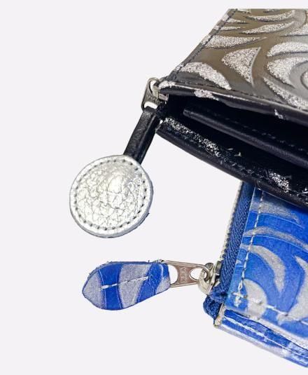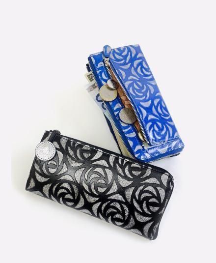 ブルーにシルバーのバラが映える、L字F束入れ。型押しされたバラ模様のシルバー、ブルーまたはブラック地も手塗りで丁寧に仕上げました。1つ1つ個性のある色合いです。