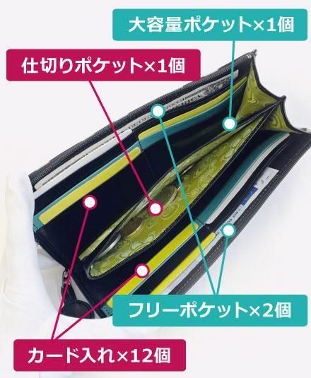 お札やレシートがたくさん入る大容量ポケットには、仕切りポケットが付いています。